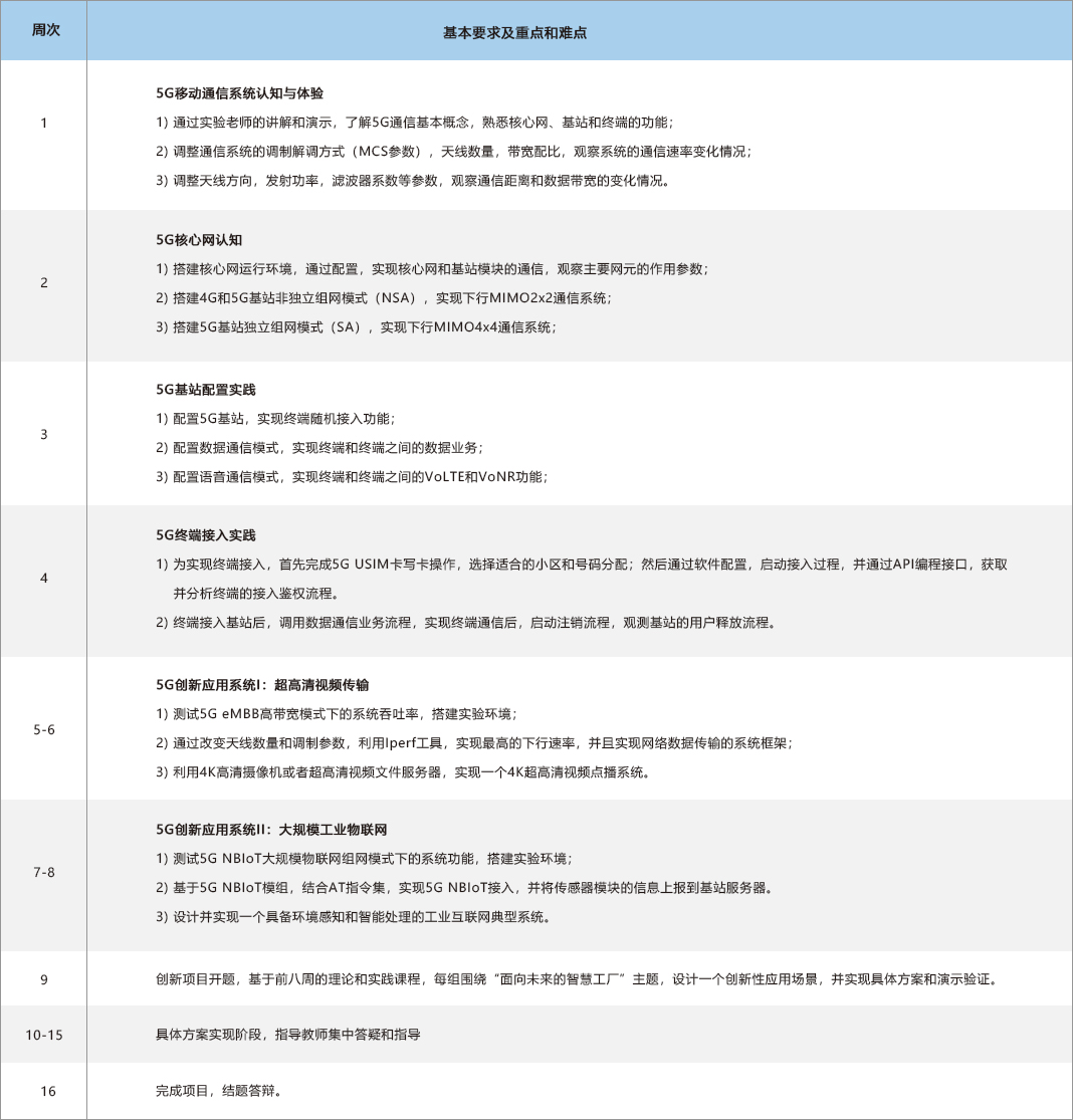 5G创新实验课程是一门通过让学生亲自体验工程项目开发的全过程,进而培养学生发现问题、勇于创新、团队协作、表达沟通、解决复杂工程问题等的工程综合能力的创新类专业核心课。
