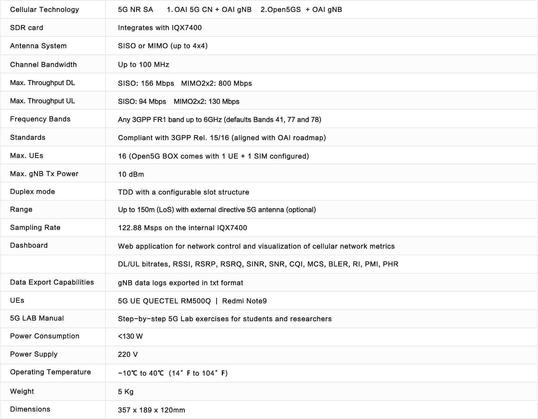 Open5G盒子预装开源的5G栈软件Open Air Interface 5G(OAI),支持新的版本移植和运行。平台可以为OAI提供稳定运行经过验证的软硬件环境,也可以根据需求定制软件和硬件来满足科研项目需求。