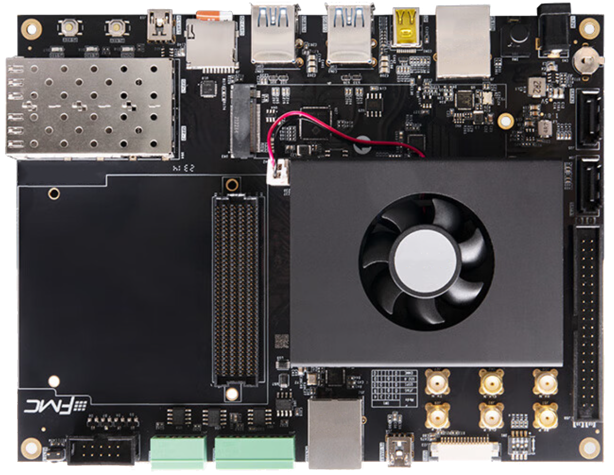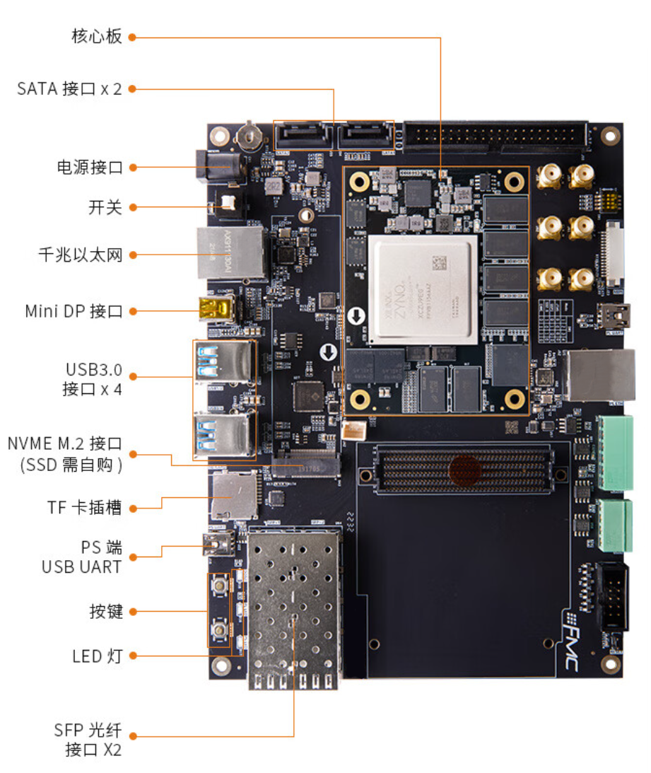 1143K逻辑单元,4路100G光纤接口,8GB PS 端 DDR4,32GB PL 端 DDR4 内存条接口,32GB EMMC FLASH,FMC HPC 2 路 FMC HPC 扩展口。